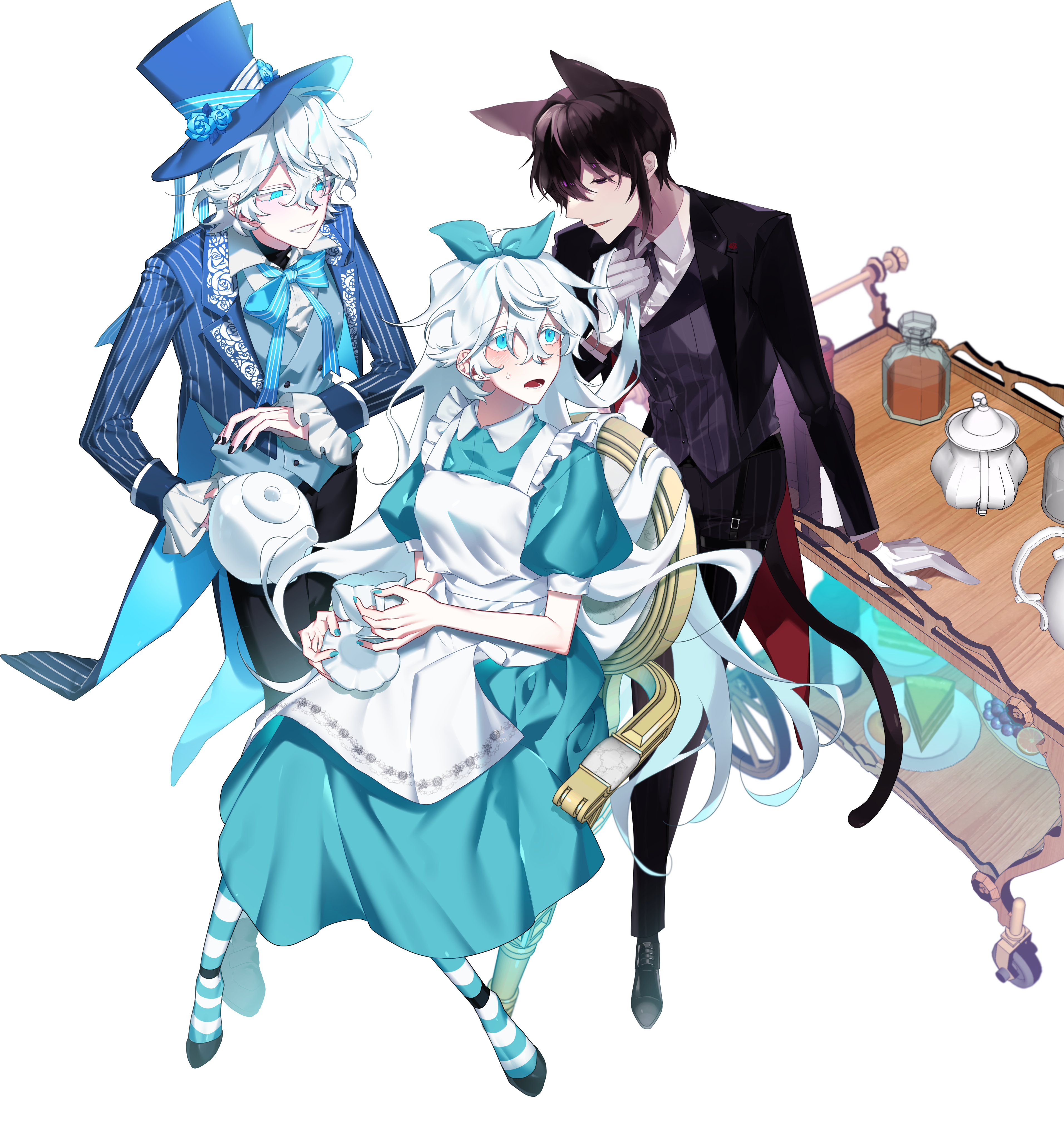 길을 헤매던 앨리스는 한참을 걷다, 모자 장수와 체셔캣이 앉은 다과상을 발견했습니다.